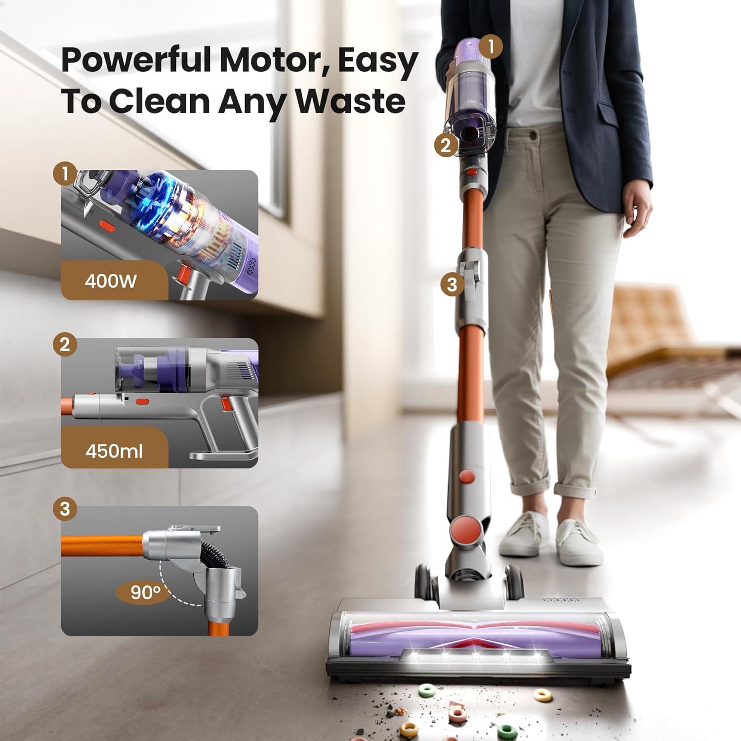 【Powerful Suction with Floor Brush】This cordless stick vacuum cleaner is equipped with a 400W motor and delivers up to 25KPA strong suction. Combined with a flexible RS545 electric floor brush, it lifts pet hair, crumbs and dust, making it one of the best vacuum cleaners for home and room essentials.