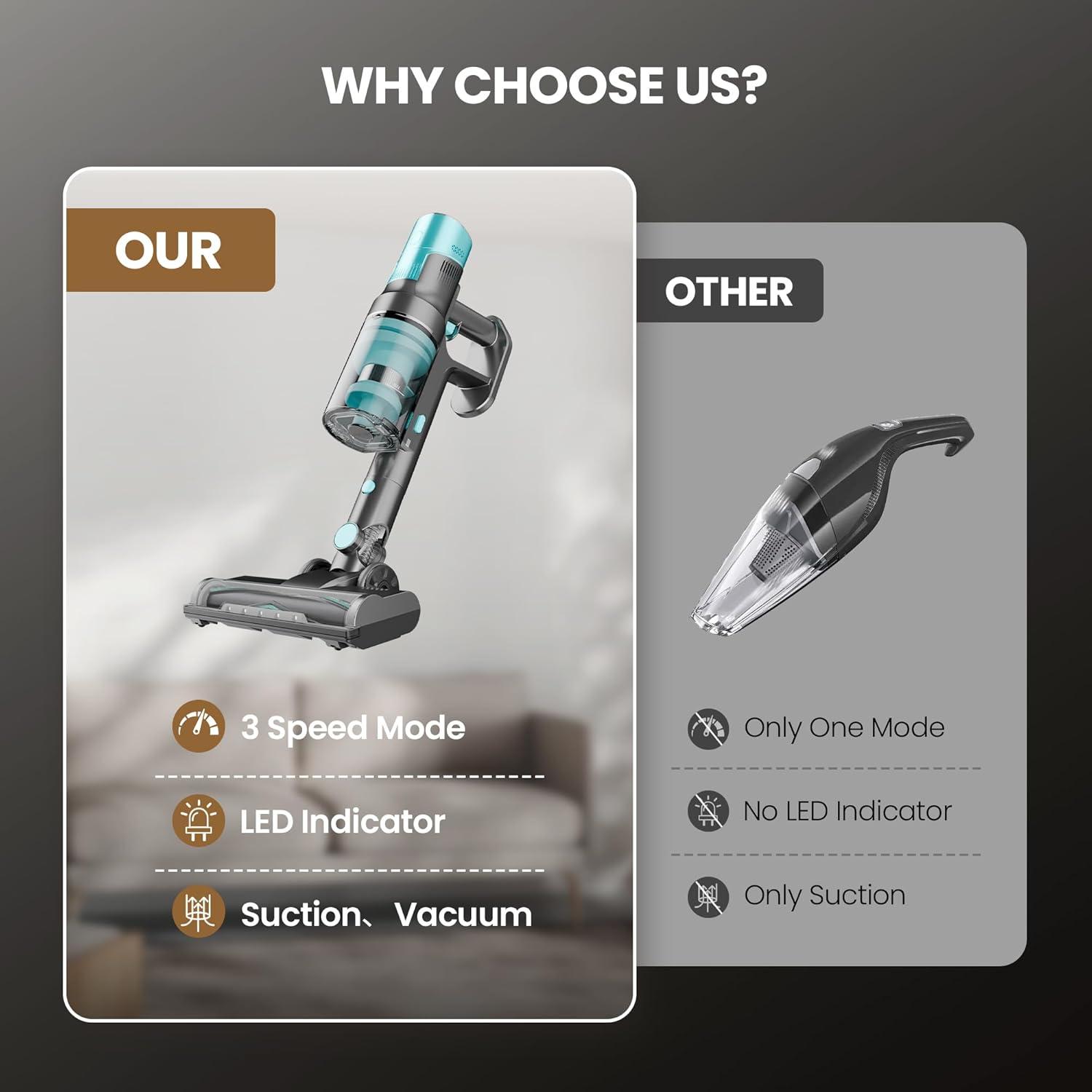 【Long Runtime & Modes】Customize your cleaning with three suction modes: up to 50 minutes in Eco, 30 minutes in Standard, and 12 minutes in Turbo. The LED headlight and touch panel make it easy to adjust for any surface or mess. The detachable rechargeable battery offers flexible charging for your vacuum cleaner.