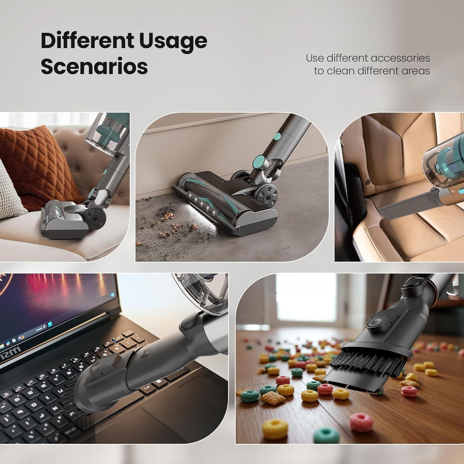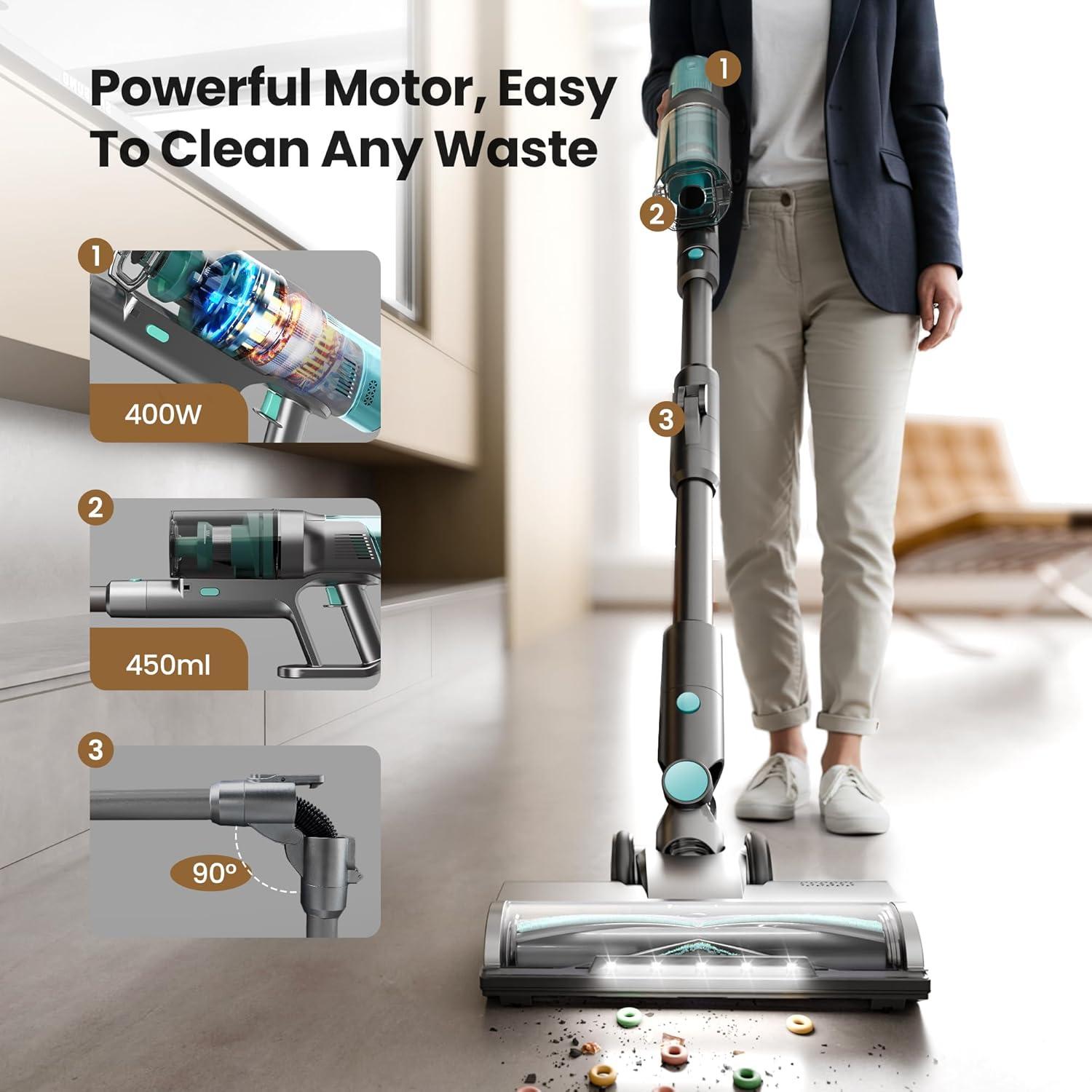 【Powerful Suction with Floor Brush】This cordless stick vacuum cleaner is equipped with a 400W motor and delivers up to 25KPA strong suction. Combined with a flexible RS545 electric floor brush, it lifts pet hair, crumbs and dust, making it one of the best vacuum cleaners for home and room essentials.