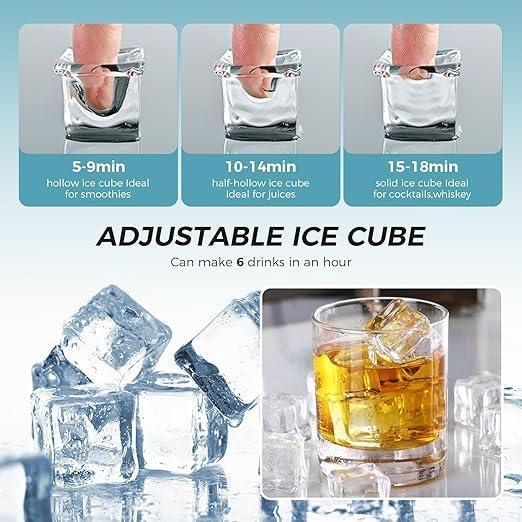 𝟏𝟔 𝐀𝐝𝐣𝐮𝐬𝐭𝐚𝐛𝐥𝐞 𝐓𝐡𝐢𝐜𝐤𝐧𝐞𝐬𝐬𝐞𝐬: Customize your ice experience with the cube ice maker's adjustable ice Settings. From hollow to solid ice cubes, unleash your creativity to create the perfect ice cube for any drink, allowing you to create something unique.