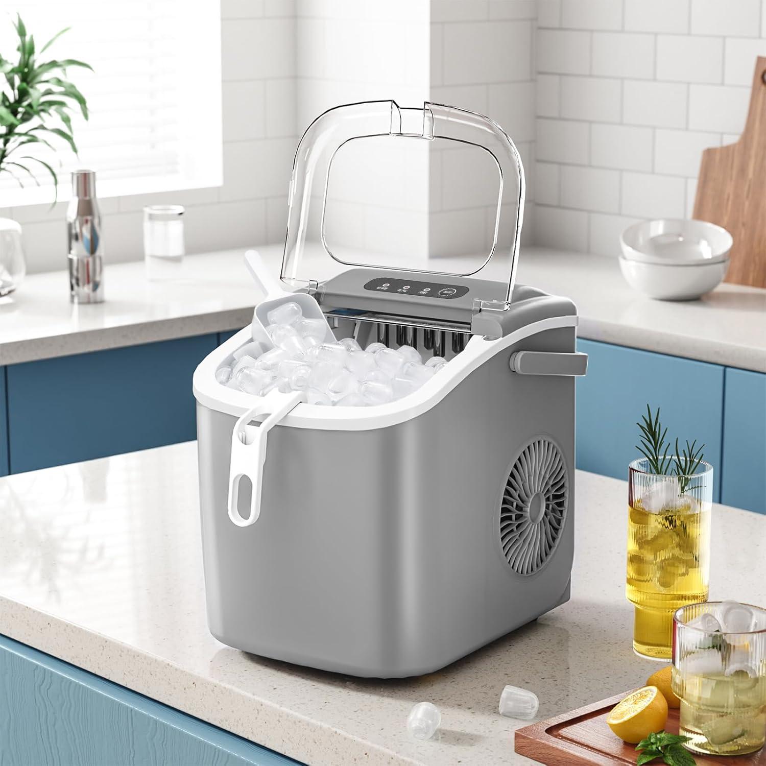 AGLUCKY Ice Makers Countertop, Portable Ice Machine Maker with Handle, Self-Cleaning, 26Lbs/24H, 9 Cubes Ready in 6 Mins, Scoop and Basket, for Home/Office/Kitchen (Black)(Grey)