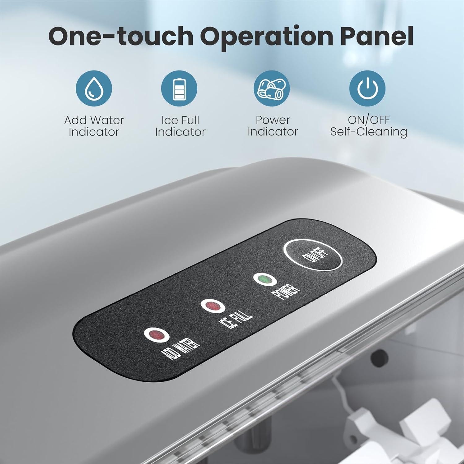 𝐓𝐫𝐚𝐧𝐬𝐩𝐚𝐫𝐞𝐧𝐭 𝐂𝐨𝐯𝐞𝐫& 𝐈𝐧𝐝𝐢𝐜𝐚𝐭𝐨𝐫: A transparent lid is mounted on top of the ice maker countertop, which allows you to see the ice-making process at all times. Our countertop ice maker with a simple and clean control panel for faster and easier operation could provide you fresh ice cubes for you and your family timely.