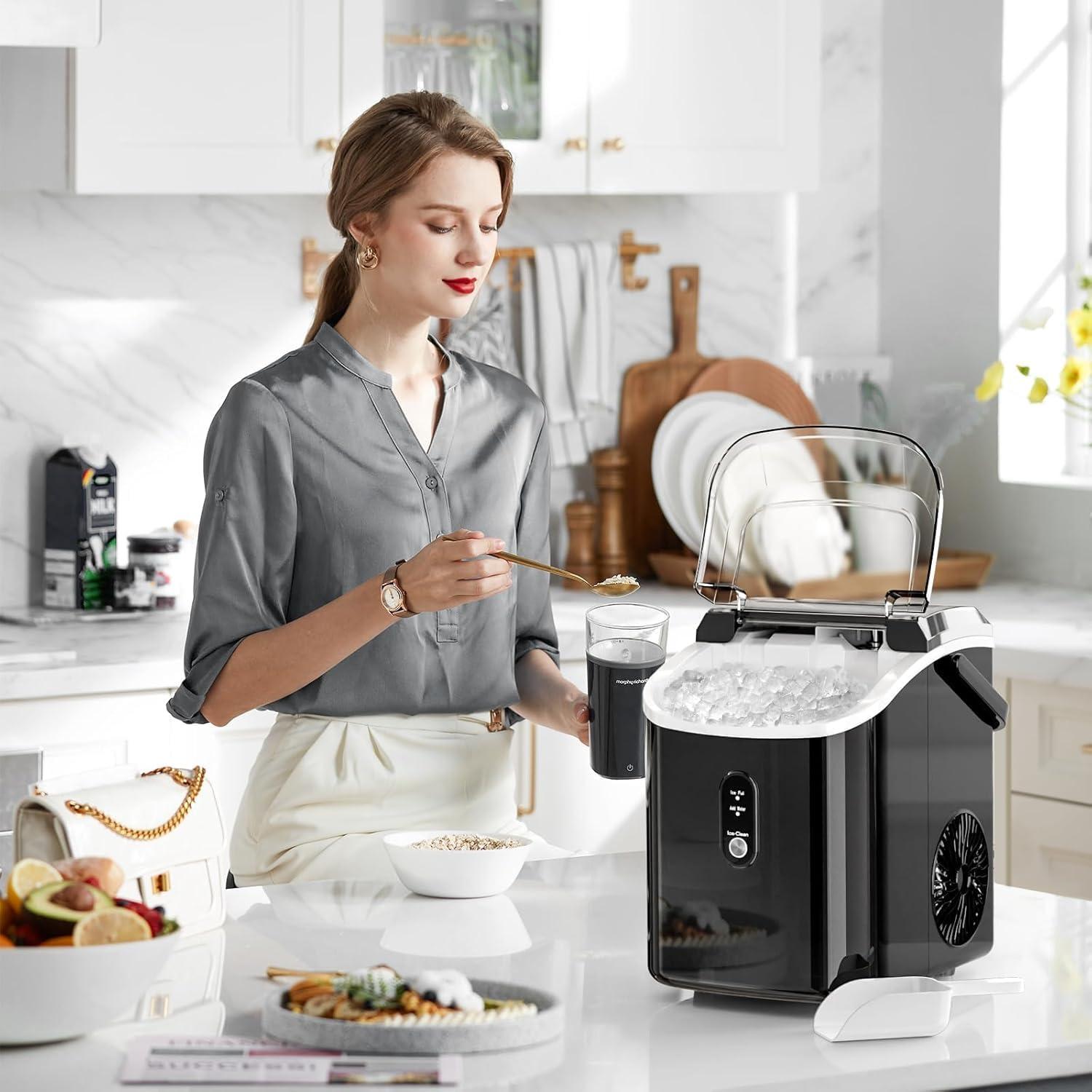 【Unrivaled Chewable Ice】:The nugget ice cubes are crystal clear, easy to chew, and melt slowly to preserve the original flavor of whiskey and cold beverages, allowing you to munch on the flavored ice cubes after you finish your drink.Meanwhile,our chewable ice maker have a clear window allows you to watch the fascinating ice cubes being produced without having to open it!